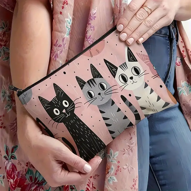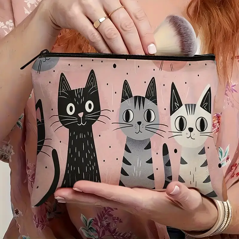 Fold, zip, and go! This charming pink pouch with a cat design is lightweight, travel-ready, and ideal for makeup or tiny treasures on the move.